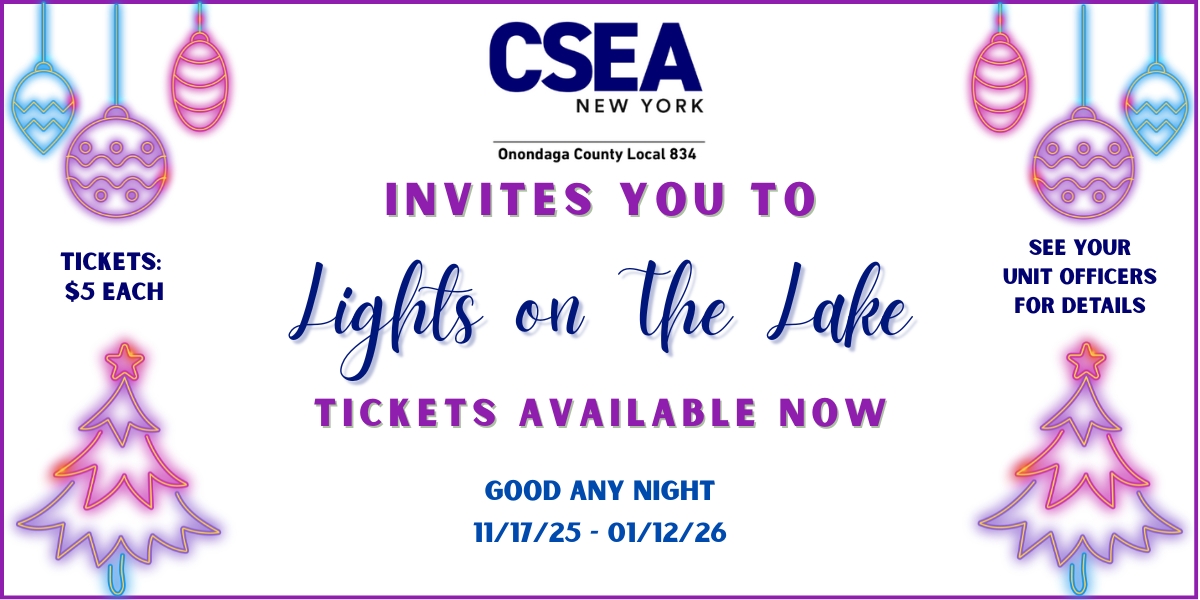 Lights on The Lake social media-1 CSEA Local 834 invites you to the 2025 Lights on the Lake Season. Get your ticket for $5 – see your unit officers for details!